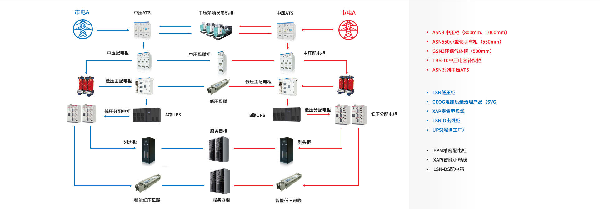 數(shù)據(jù)中心的電力供應(yīng),把握著數(shù)據(jù)中心業(yè)務(wù)運營的命脈。對于廣大數(shù)據(jù)中心管理和運維人員而言,保持?jǐn)?shù)據(jù)中心電力的穩(wěn)定供應(yīng),是他們工作的重中之重。一個完善可靠的供配電系統(tǒng)是保證計算機(jī)設(shè)備、環(huán)境設(shè)備和輔助用電設(shè)備可靠運行的先決條件。伊頓有著完整的供配電產(chǎn)品解決方案,為客戶的數(shù)據(jù)中心提供穩(wěn)定可靠高效的電源,最大化減少供配電系統(tǒng)故障對數(shù)據(jù)和數(shù)據(jù)業(yè)務(wù)的影響,為安全、便捷、智能的數(shù)據(jù)存儲、通信和處理以及未來發(fā)展提供基本保障。庫柏(寧波)可提供數(shù)據(jù)中心配電解決方案包括的產(chǎn)品有:中壓雙電源系統(tǒng),ASN3-ATC,小型化中壓開關(guān)柜ASN550,小型化環(huán)保氣體中壓開關(guān)柜GSN3,低壓主配電柜Edison LSN,低壓二次配電產(chǎn)品Edison LSN-D精密配電柜EPM以及LSN-DS配電箱等產(chǎn)品。